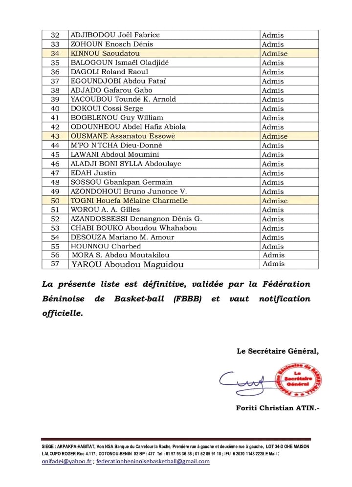 La liste officielle des admis à la Formation des Coachs Animateurs du Bénin (CAB) est désormais disponible. Au total, 57 candidats ont été retenus à l’issue du processus de sélection, marquant une nouvelle étape dans le renforcement des compétences techniques et pédagogiques des encadreurs de basketball au Bénin.